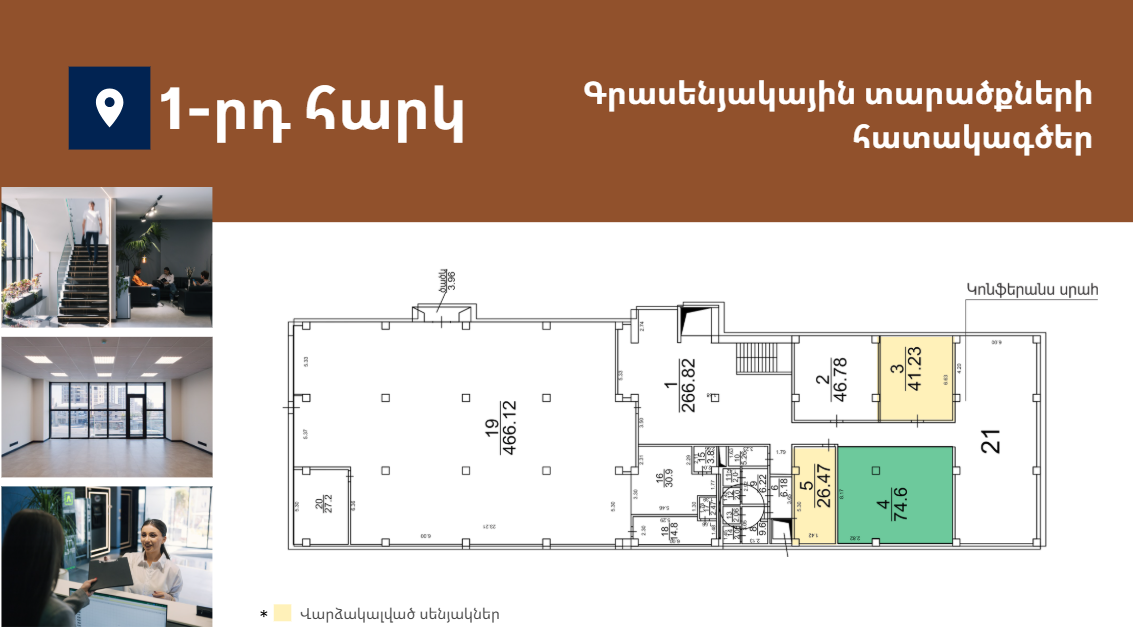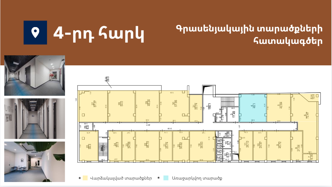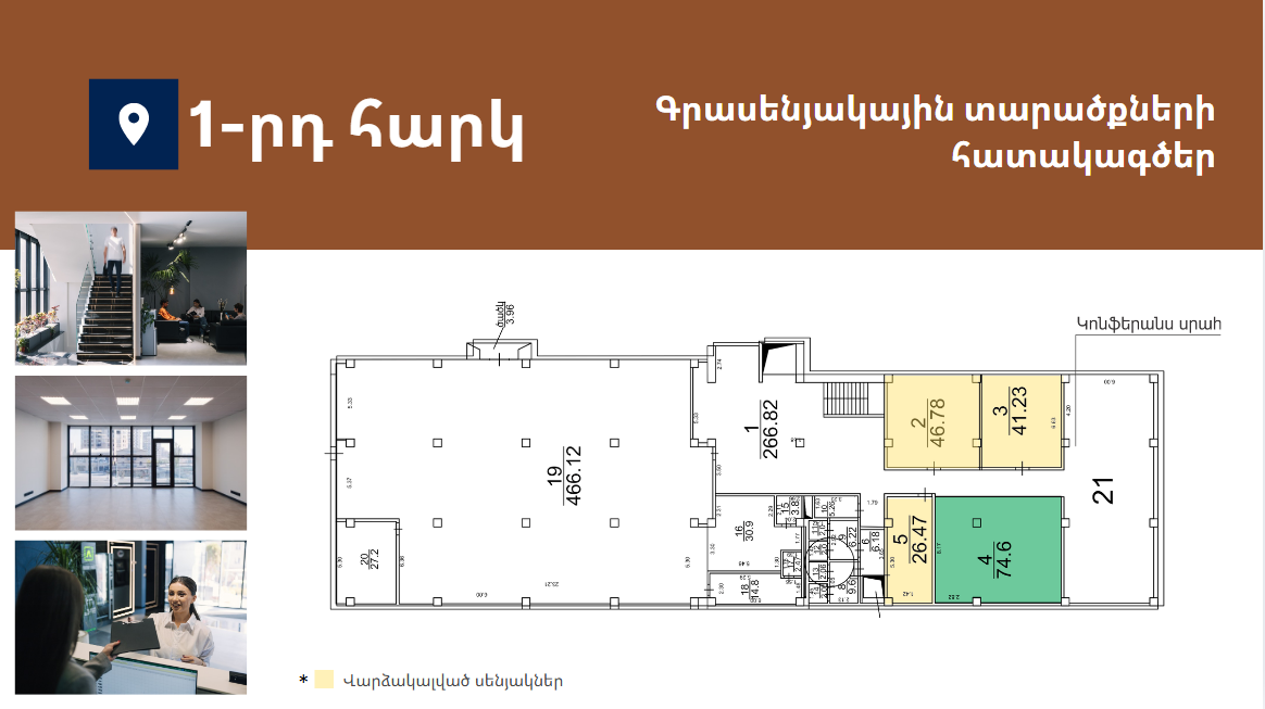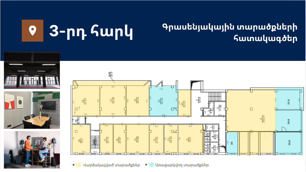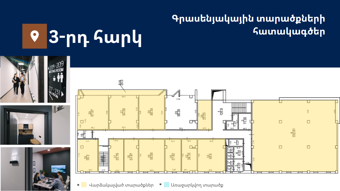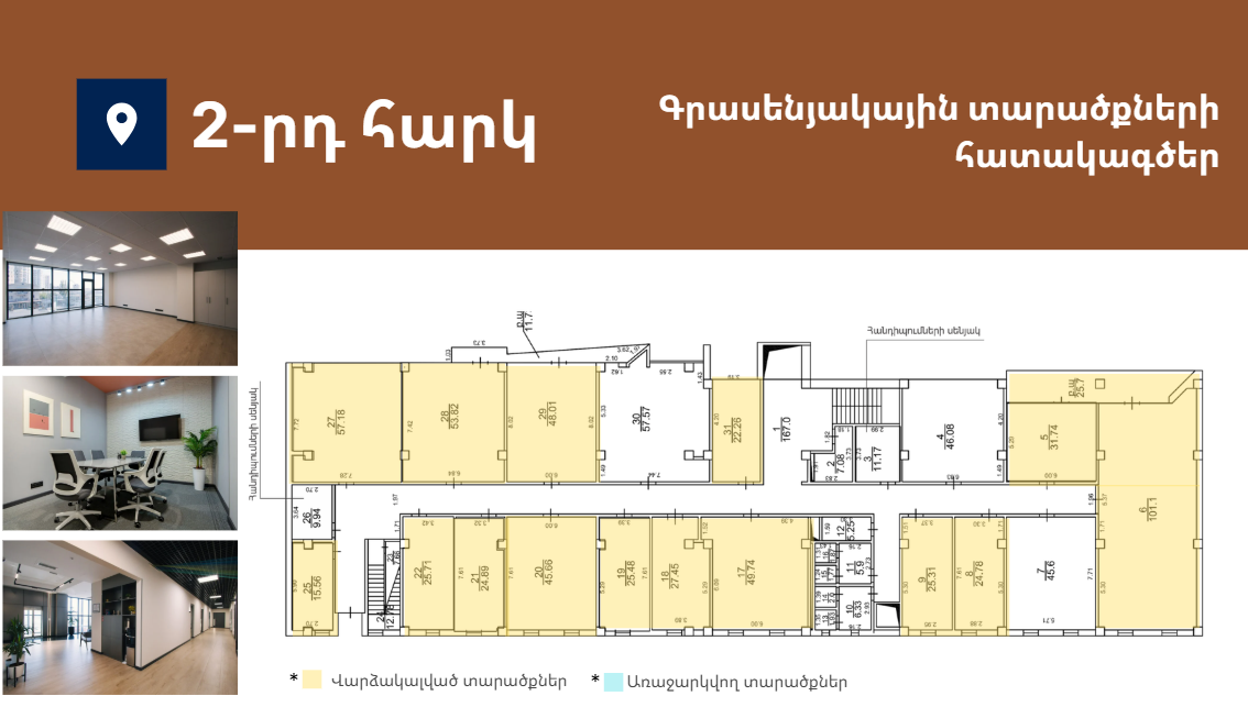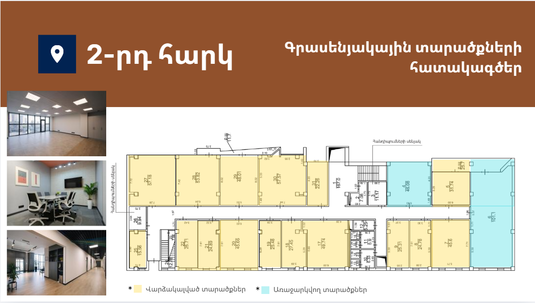 Առաջարկում է 15-ից 332քմ լուսավոր և հարմարավետ գրասենյակային տարածքներ։ Գտնվում է Աջափնյակ վարչական շրջանում՝ Երևանի կենտրոնից ընդամենը 7կմ հեռավորության վրա՝ հյուսիս-հարավ մայրուղու առաջին գիծ։ Նոր, պրեմիում դասի բիզնես կենտրոն՝ հագեցած նորագույն տեխնոլոգիաներով և ժամանակակից դիզայնով։