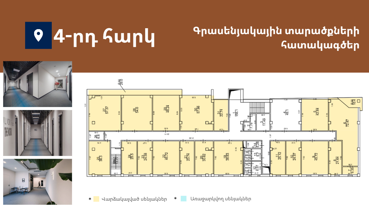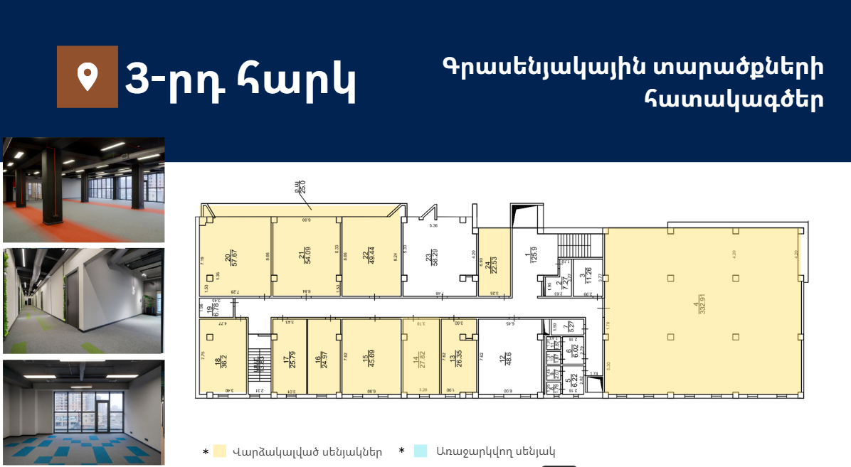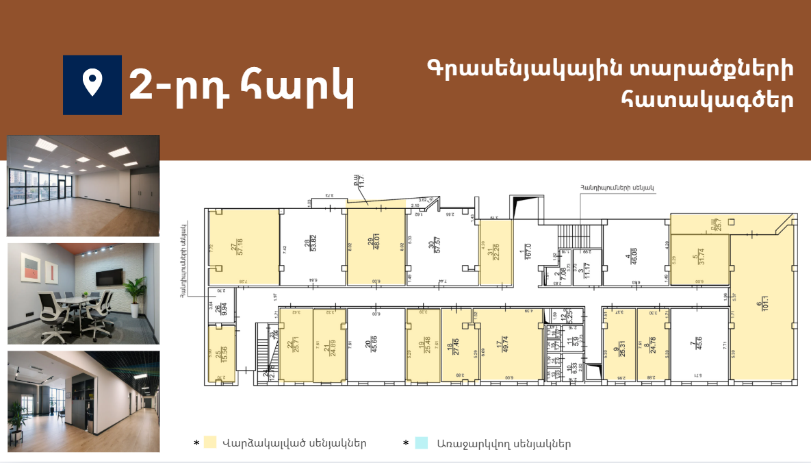 Առաջարկում է 15-ից 332քմ լուսավոր և հարմարավետ գրասենյակային տարածքներ։ Գտնվում է Աջափնյակ վարչական շրջանում՝ Երևանի կենտրոնից ընդամենը 7կմ հեռավորության վրա՝ հյուսիս-հարավ մայրուղու առաջին գիծ։ Նոր, պրեմիում դասի բիզնես կենտրոն՝ հագեցած նորագույն տեխնոլոգիաներով և ժամանակակից դիզայնով։